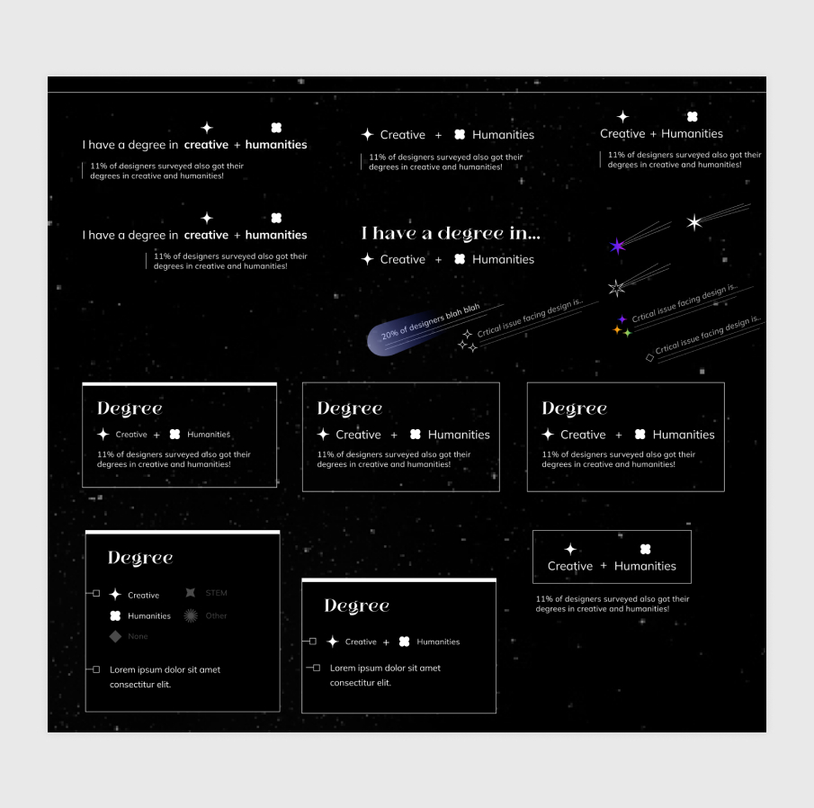 Apart from the concept development, which each member came up with 3-4 concept sketching, I was responsible for the design and prototype of the home page, which includes the constellation map and the fitlering system. I also took a secondary role in the creation of the design system—mainly deciding on the header typface—and the determination of the rules that govern the constellation forms.